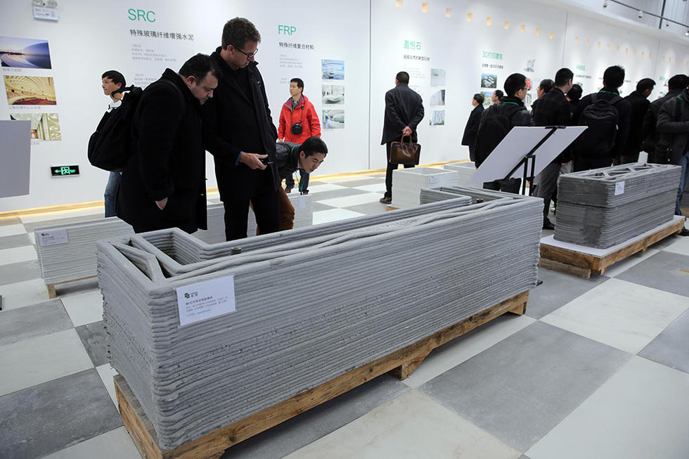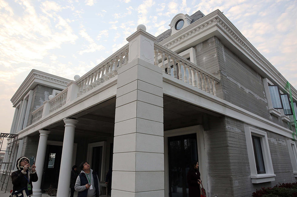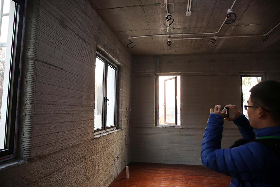就在昨天1月18日,兩名行人從3D打印制成的別墅旁經(jīng)過。數(shù)幢使用3D打印技術(shù)建造的建筑亮相蘇州工業(yè)園區(qū)。這批建筑包括一棟面積1100平米的別墅和一棟6層居民樓。這些建筑的墻體由大型3D打印機(jī)層層疊加噴繪而成,而打印使用的“油墨”則由建筑垃圾制成。